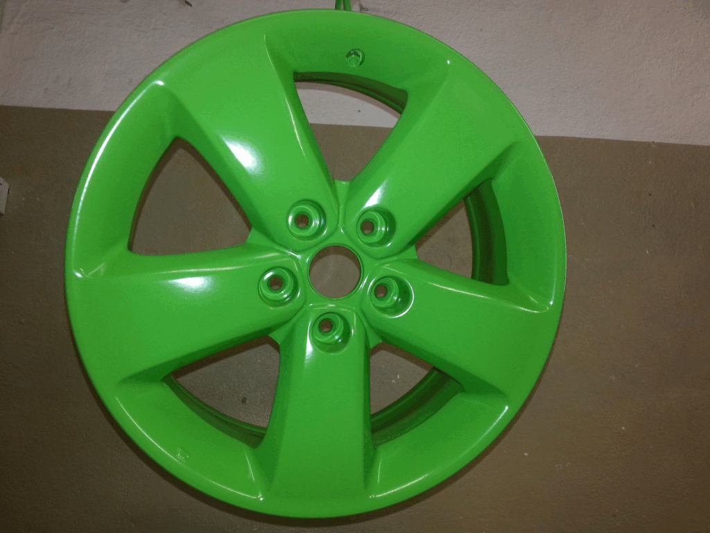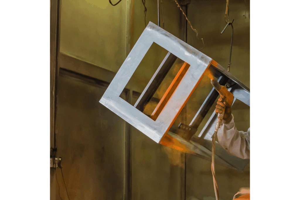 溶剤を使わず、粉末状の塗料を静電気で金属表面に付着させ、高温で焼き付けて塗膜を形成します。